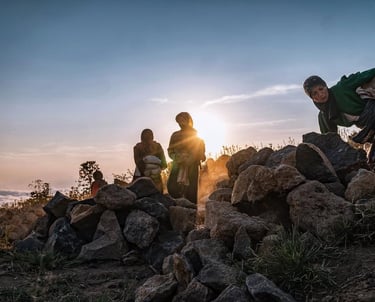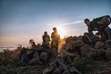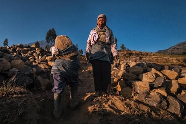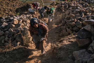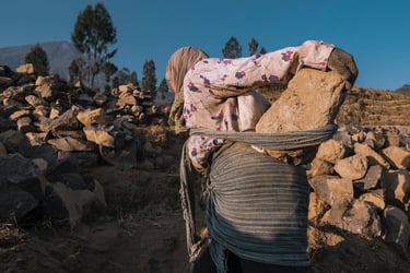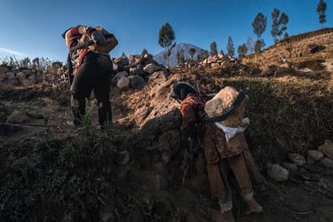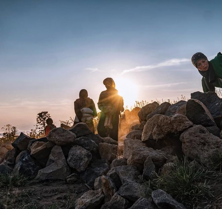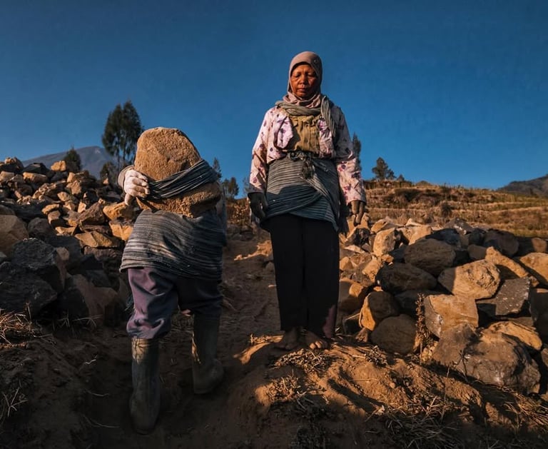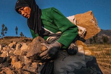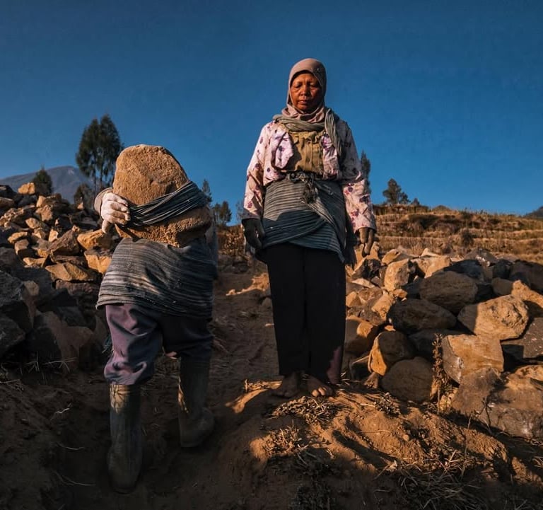 Di ketinggian 2.200 mdpl mereka menambang batu-batu andesit gunung Sindoro untuk dijual. Hawa dingin menusuk tulang pagi itu di elevasi 2.200 mdpl. Selepas subuh para ibu-ibu ini sudah berangkat dari rumah mereka di Ngadirejo Temanggung Jawa Tengah untuk bekerja mengangkut batu di lereng gunung Sindoro yang cukup terjal. Mereka angkut batu menuju lokasi ke tempat yang agak rata agar truk bisa menjangkaunya. Rutinitas pagi selepas musim panen tembakau.